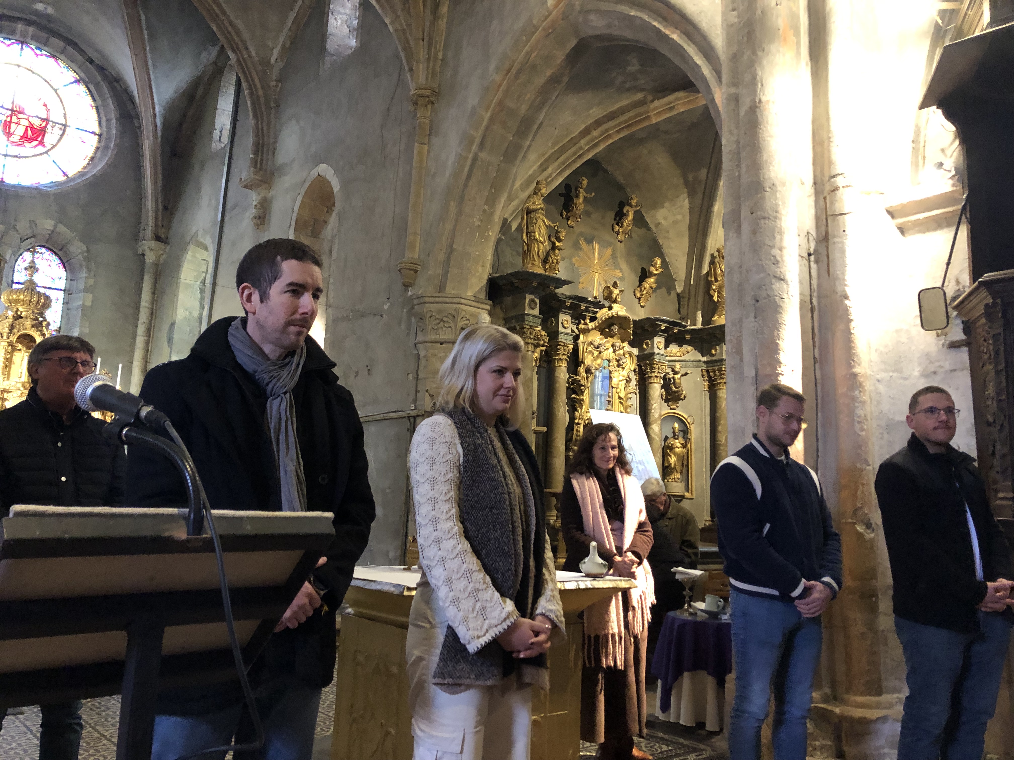 La famille et les amis attendent la fin de la messe pour entrer dans l’église. Ceux qui le souhaitent, peuvent venir à la messe.